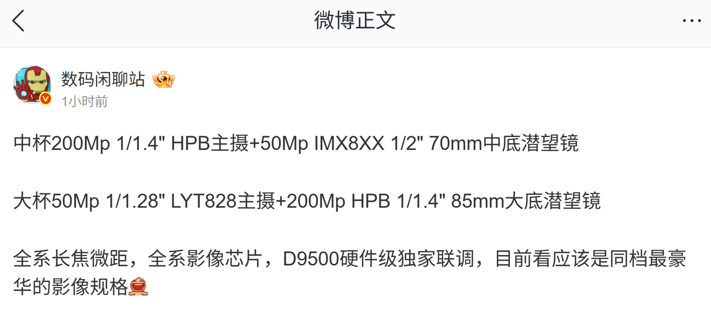 主摄:5000 万像素 1/1.28 英寸 LYT828长焦:2 亿像素 1/1.4 英寸 HPB CMOS 85mm 大底潜望镜结合博主文中暗示和评论区回复,预计这款手机是 vivo X300 系列。